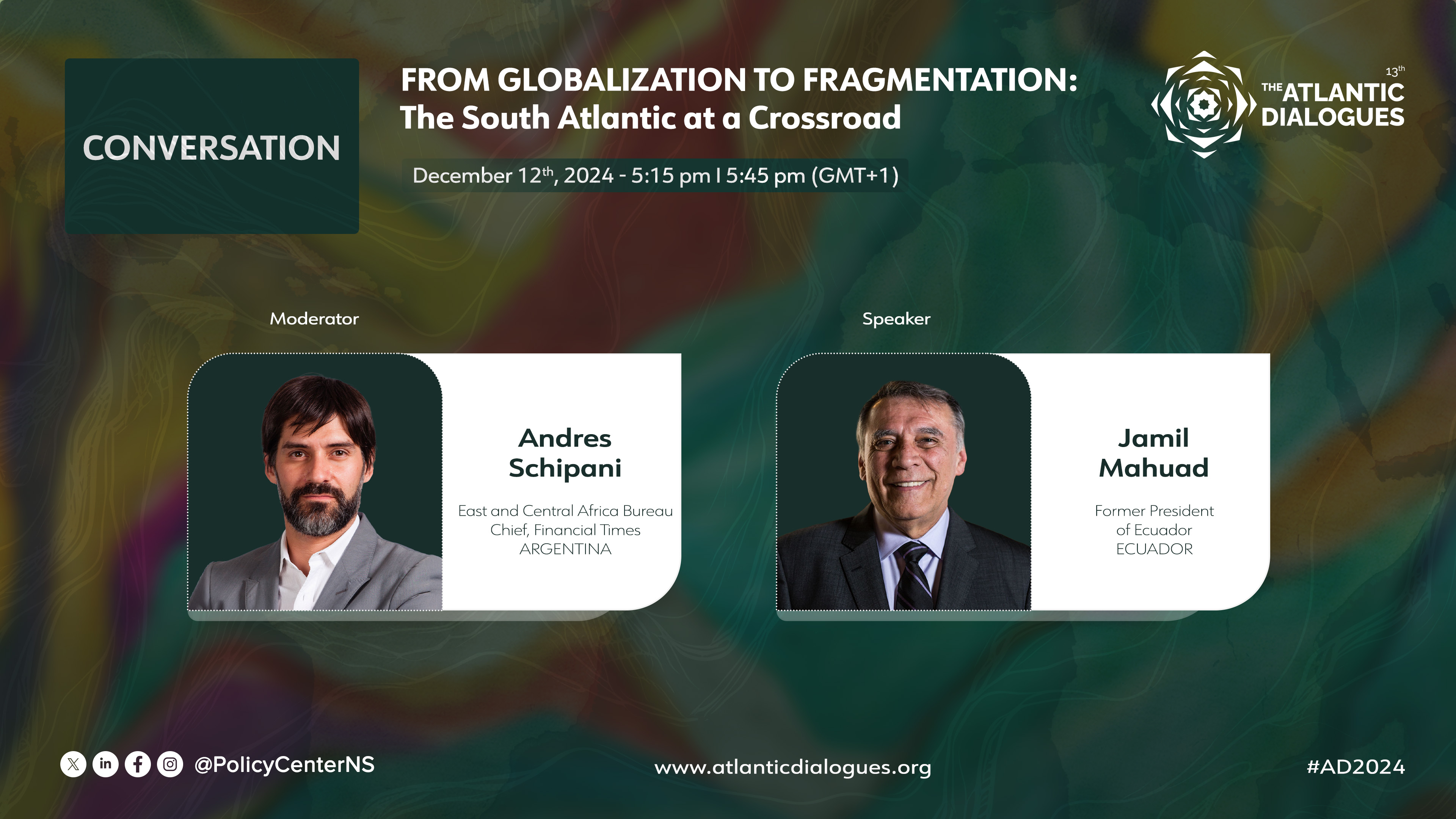 Back Conversation From Globalization to Fragmentation: The South Atlantic at a Crossroad Thu, 12/12/2024 - 17:15 From Globalization to Fragmentation: The South Atlantic at a Crossroad Conversación: De la globalización a la fragmentación: el Atlántico Sur en una encrucijada Conversation : De la mondialisation à la fragmentation : l’Atlantique Sud à la croisée des chemins محادثة: من العولمة إلى التجزئة: جنوب المحيط الأطلسي عند مفترق الطرق